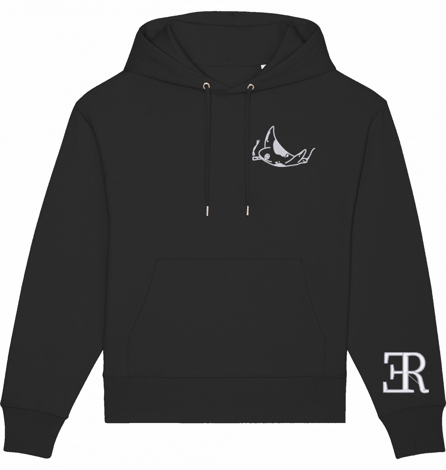 Der EEN ROOCHEN Hoodie "weißer Rochen" präsentiert sich mit einem sorgfältig gestickten Logo auf der Brust und einem eleganten Schriftzug am Ärmel, der seine Hochwertigkeit unterstreicht.